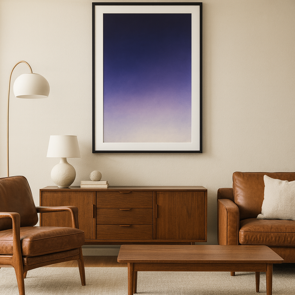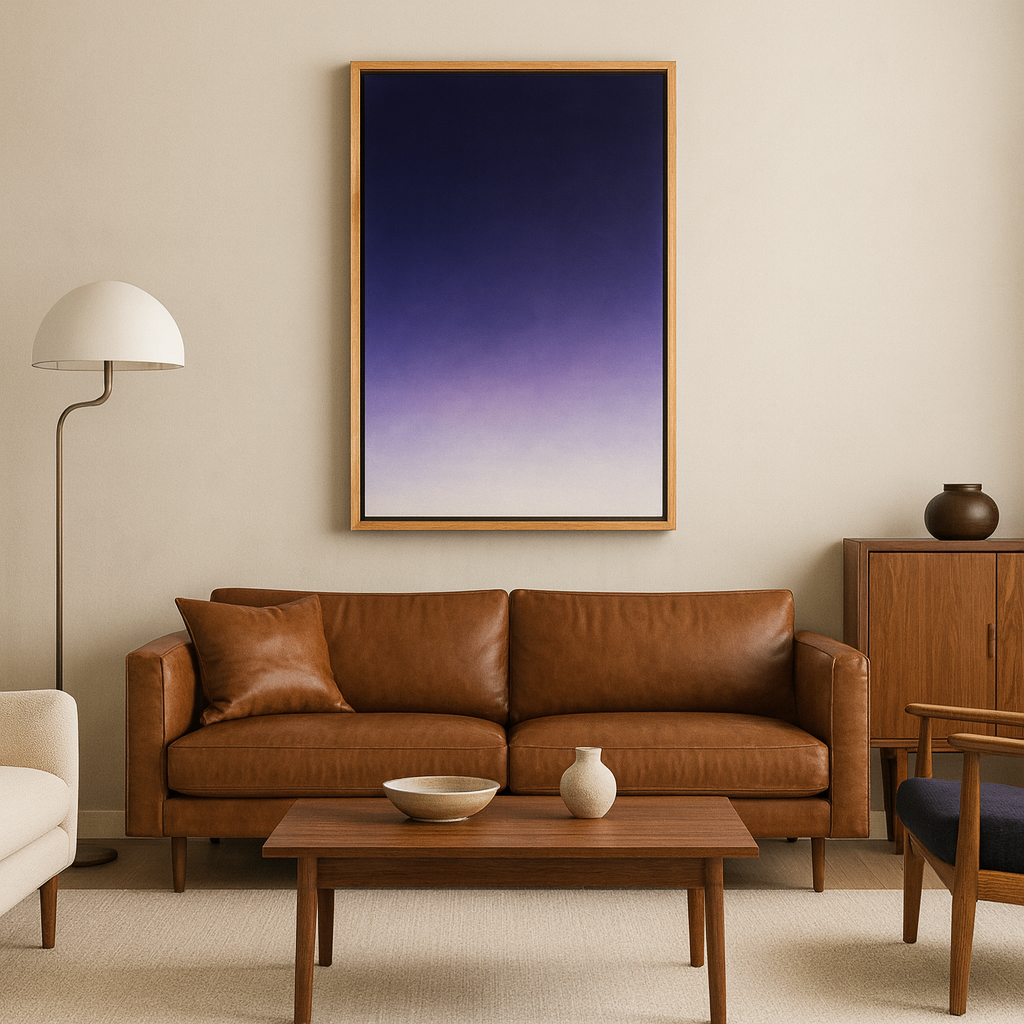Step into the quiet elegance of dusk with Twilight Reverie, a modern abstract painting that captures the serene transition between day and night. This luxury wall art flows from deep indigo at the top into soft lavender and muted ivory at the base, creating a seamless gradient reminiscent of twilight skies. The composition is minimal yet emotionally profound, designed to invite calm reflection and refined sophistication into any interior.